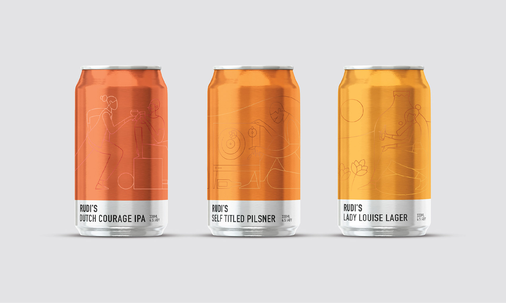 這是新西蘭的啤酒品牌Rudi's Beers包裝設(shè)計(jì)以紅、黃、橘三個(gè)暖色為主,傳達(dá)一種喝啤酒時(shí)的開心歡樂的情緒,再搭配鋁罐的金屬質(zhì)地來呈現(xiàn)啤酒的濃郁醇厚,結(jié)合插畫的形式創(chuàng)造了一款獨(dú)特個(gè)性的包裝設(shè)計(jì),在競爭激烈的精良啤酒市場中清晰的區(qū)分了他們的品牌。