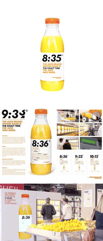 法國(guó)一家連鎖超市Intermarché的鮮榨柳橙汁,為表示其新鮮程度,直接就在瓶子的標(biāo)簽上大大地印上了榨汁時(shí)間,每一瓶的榨汁時(shí)間都在變化。據(jù)報(bào)道,這瓶柳橙汁的逆襲,為超市增加了25%的來(lái)客數(shù),而且因?yàn)檫@個(gè)成功的包裝設(shè)計(jì),3小時(shí)就贏得了5000萬(wàn)次的曝光量。