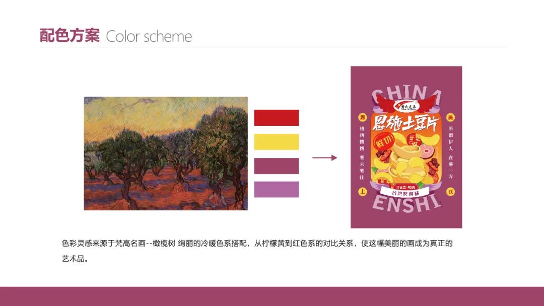 主畫面風格選用插畫形式來突出產品高級感的特點。對稱圖形增加形式美感,強烈的視覺擊感帶給我們更多浪漫感的色彩元素。整體在畫面的構成上手繪出一個土豆,通過鮮切的手法,變幻出各種形態的手繪薯片,通過手繪番茄等元素的組合,他們共同遨游在薯片的世界里,鮮美可口的番茄汁,滴在薯片上滴滴入味。這種充滿變幻色彩的想象力讓整個畫面更具有魔幻感。